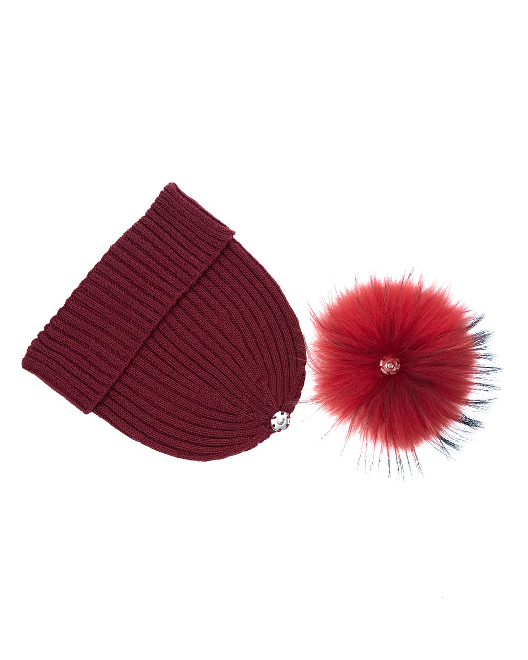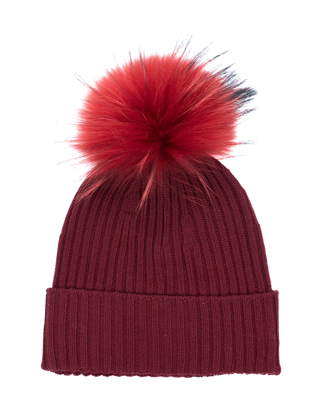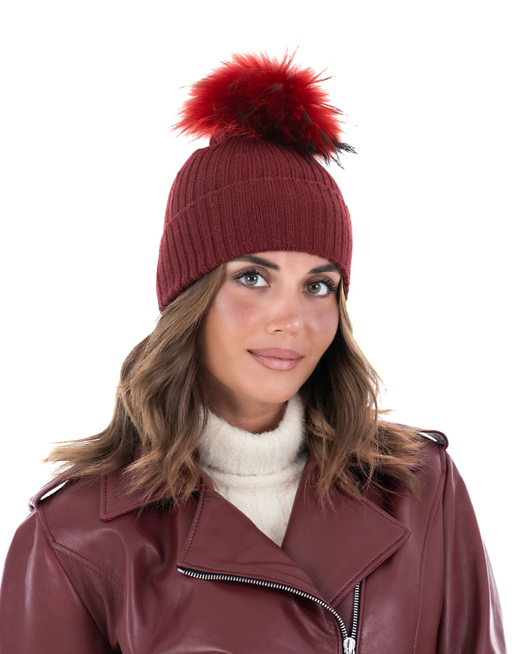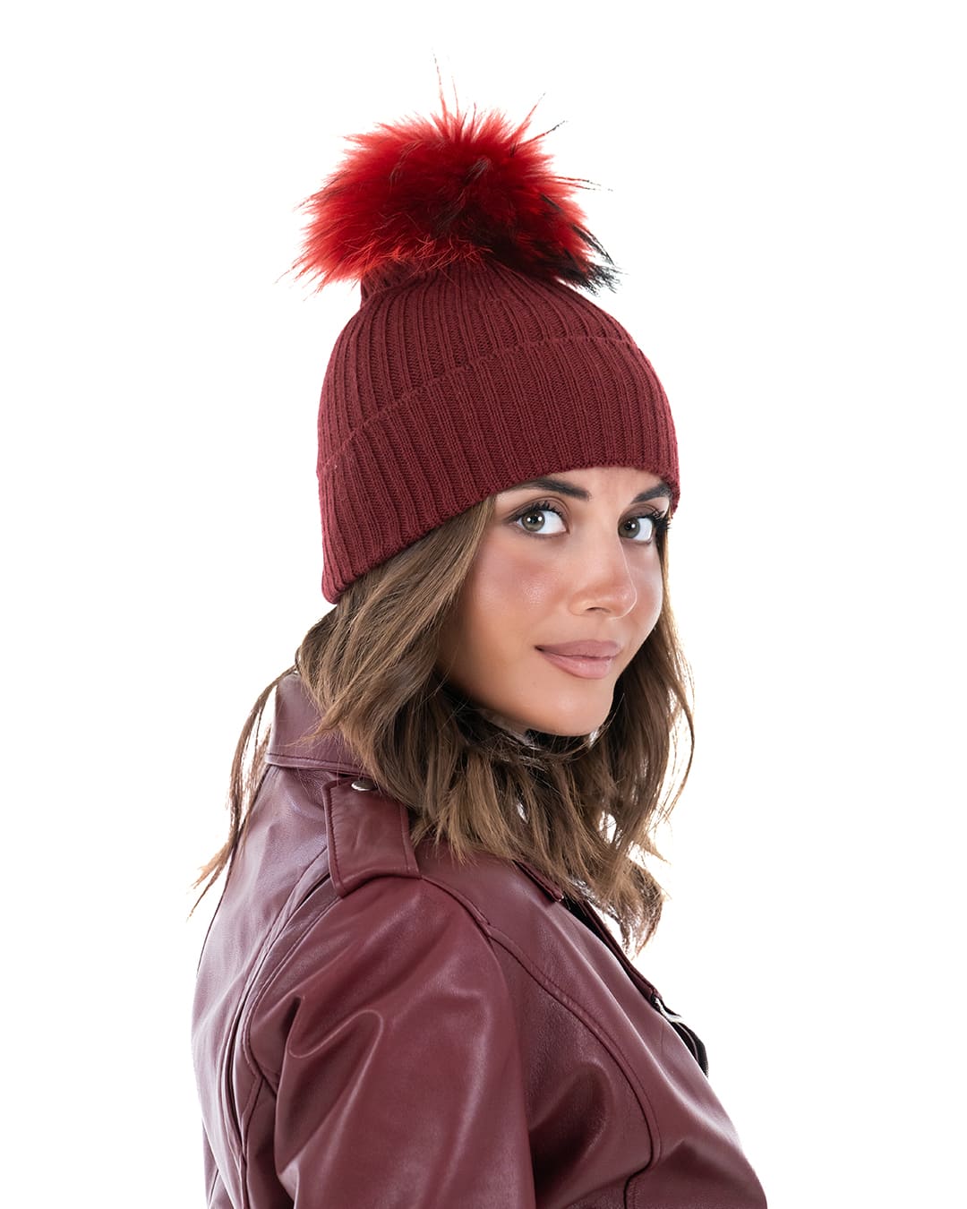 Cappello donna in lana bordeaux con pompon in pelliccia